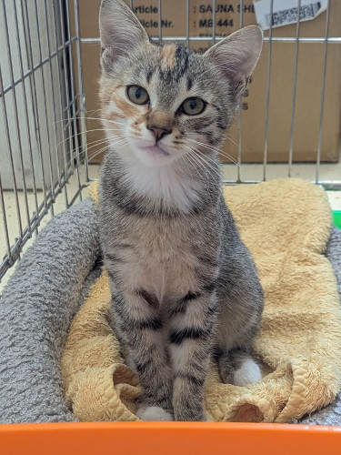 Kein Chip, kein Tattoo, hellgrau getigert. Aufgeschlossen, sucht Anschluss, gesprächig.