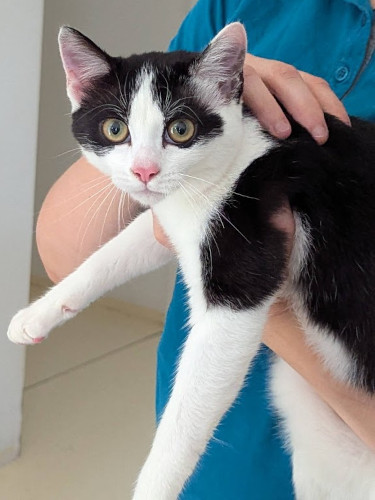 Es handelt sich um einen schwarz-weißen Kater, der jetzt etwa 9 Wochen